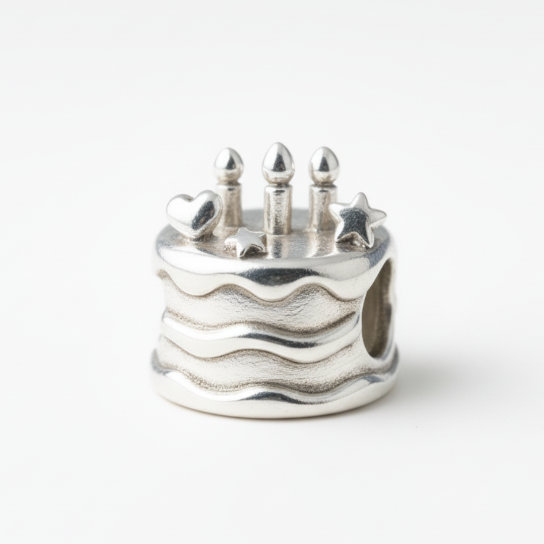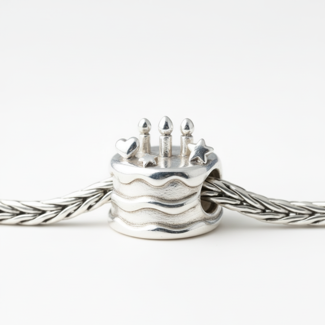 A silver bead celebrating a universally joyful moment ; birthdays, shared memories, and the simple pleasure of marking special days on a Trollbeads bracelet.