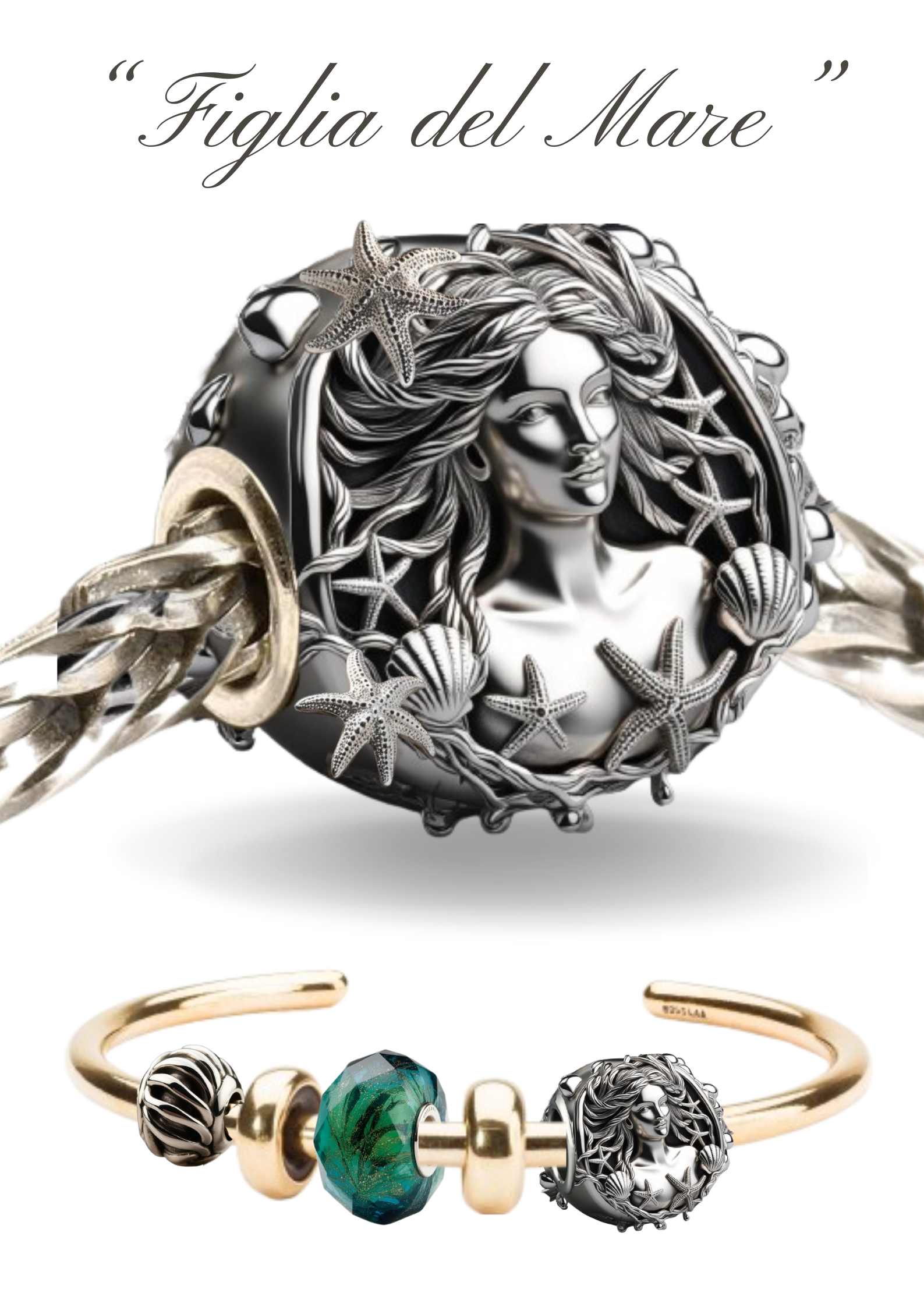 "Figlia del Mare" è un bead in argento che rappresenta il legame profondo tra la regalità degli abissi e la fluttuante vita marina. Il titolo, dunque, richiama le origini nobili della ninfa e la profondità dell’Oceano. E’ dedicato alla figura mitologica di Posidonia, figlia di Poseidone, che secondo una leggenda mediterranea trasformò i suoi lunghi capelli verdi nella preziosa pianta marina per proteggere i pesci. Oltre ad evocare la figura mitologica evoca anche la preziosa pianta marina, la Posidonia Oceanica, il cuore pulsante del Mediterraneo.