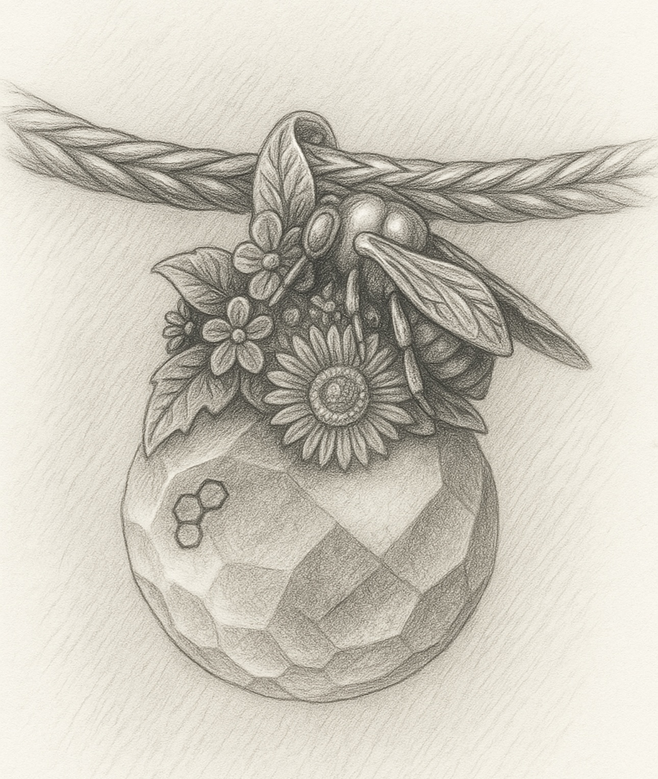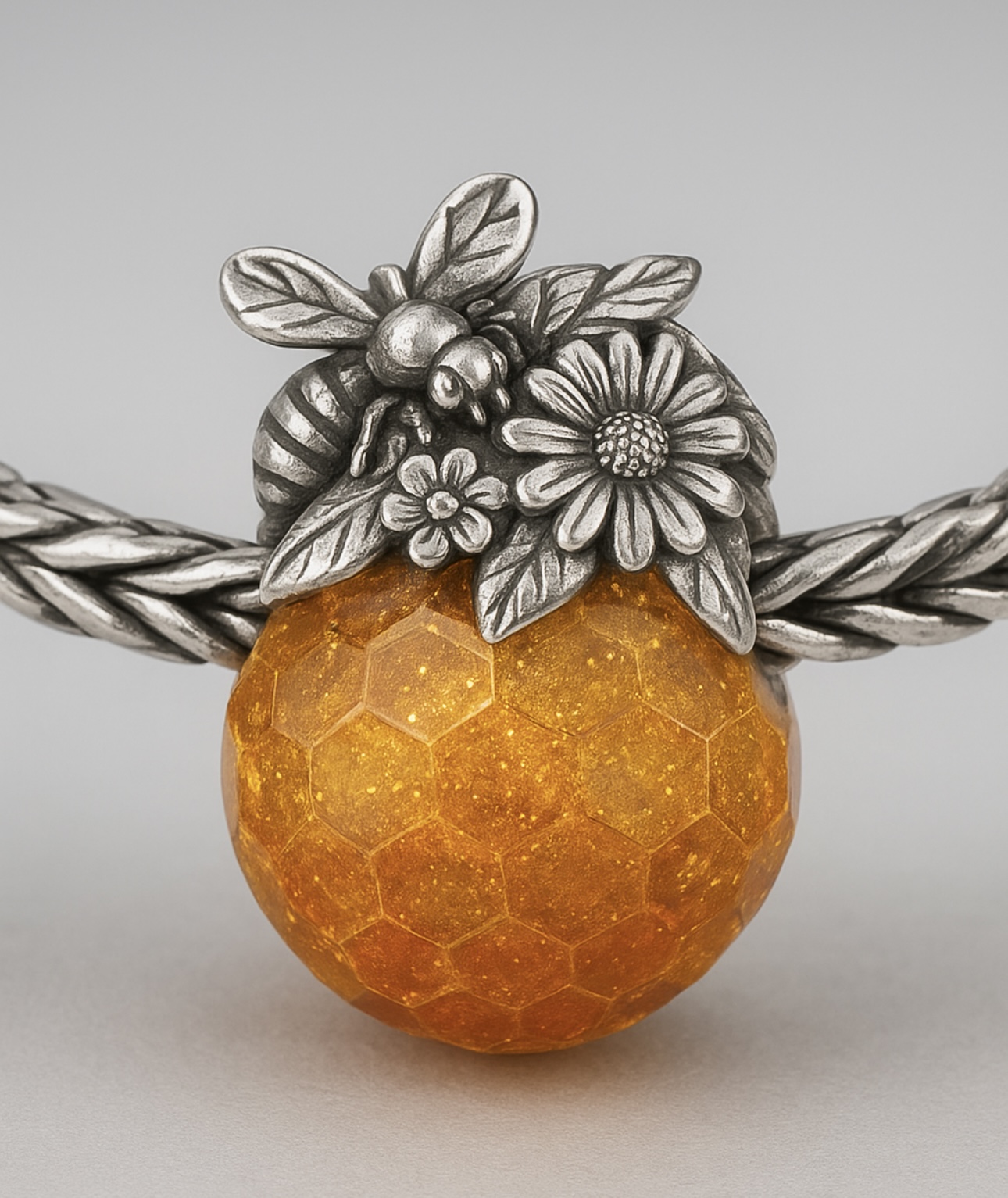 This is a silver and gold coloured glass filled with gold glitter dangle bead. The glass or amber would have hexagon shaped facets and the silver design would be wildflowers and a single, detailed, fat honeybee.
