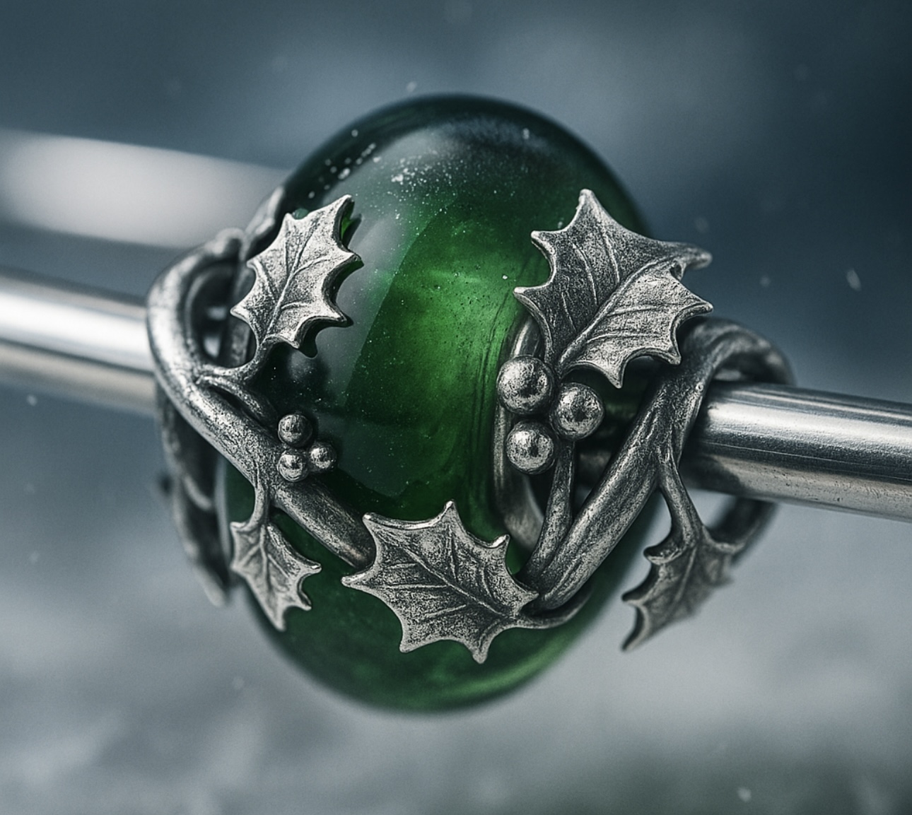 A silver design of Holly and ivy, that wraps around a glass bead.