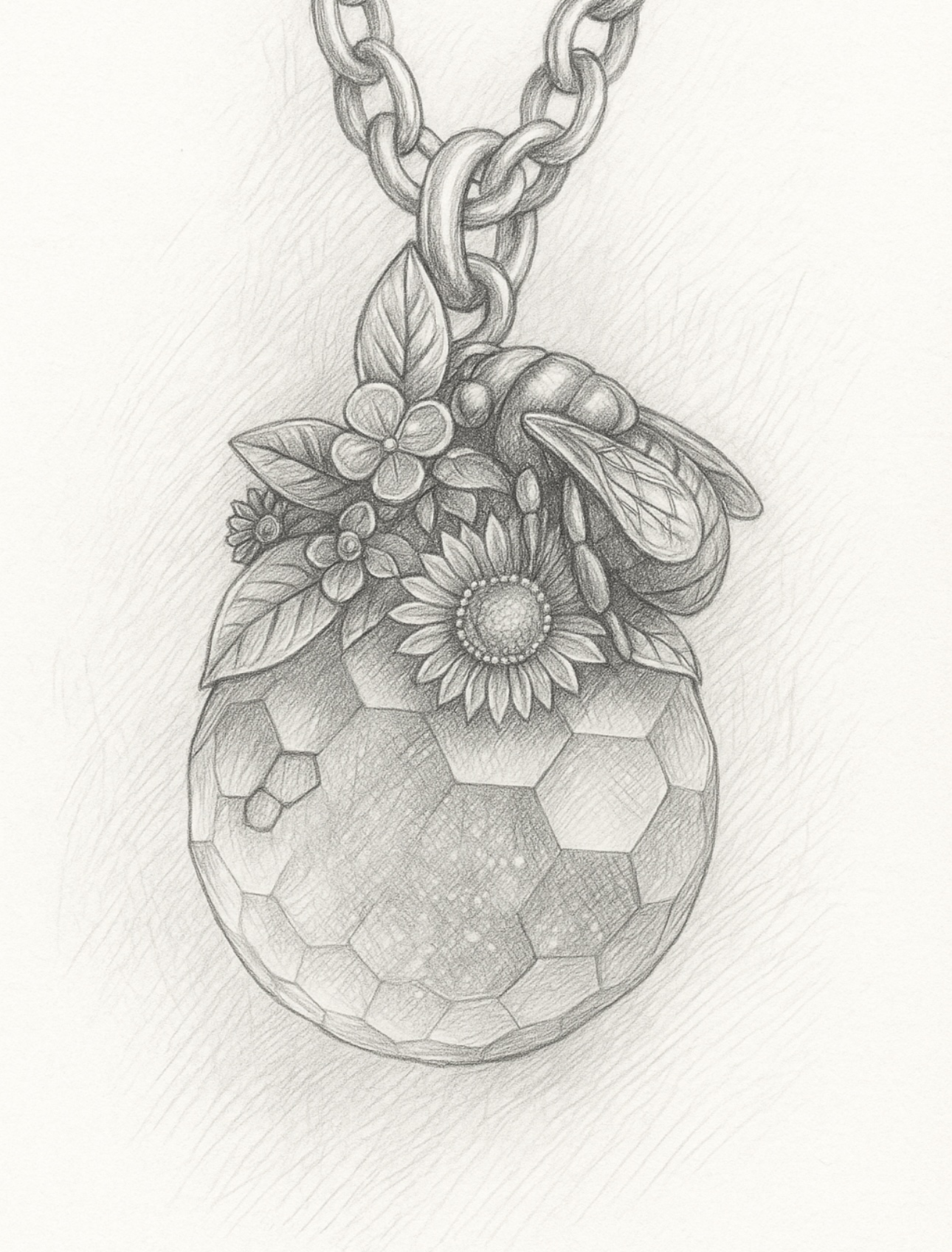 This is a silver and gold coloured glass filled with gold glitter fantasy necklace. The glass would have hexagon shaped facets and the silver design would be wildflowers and a single, detailed, fat honeybee.
