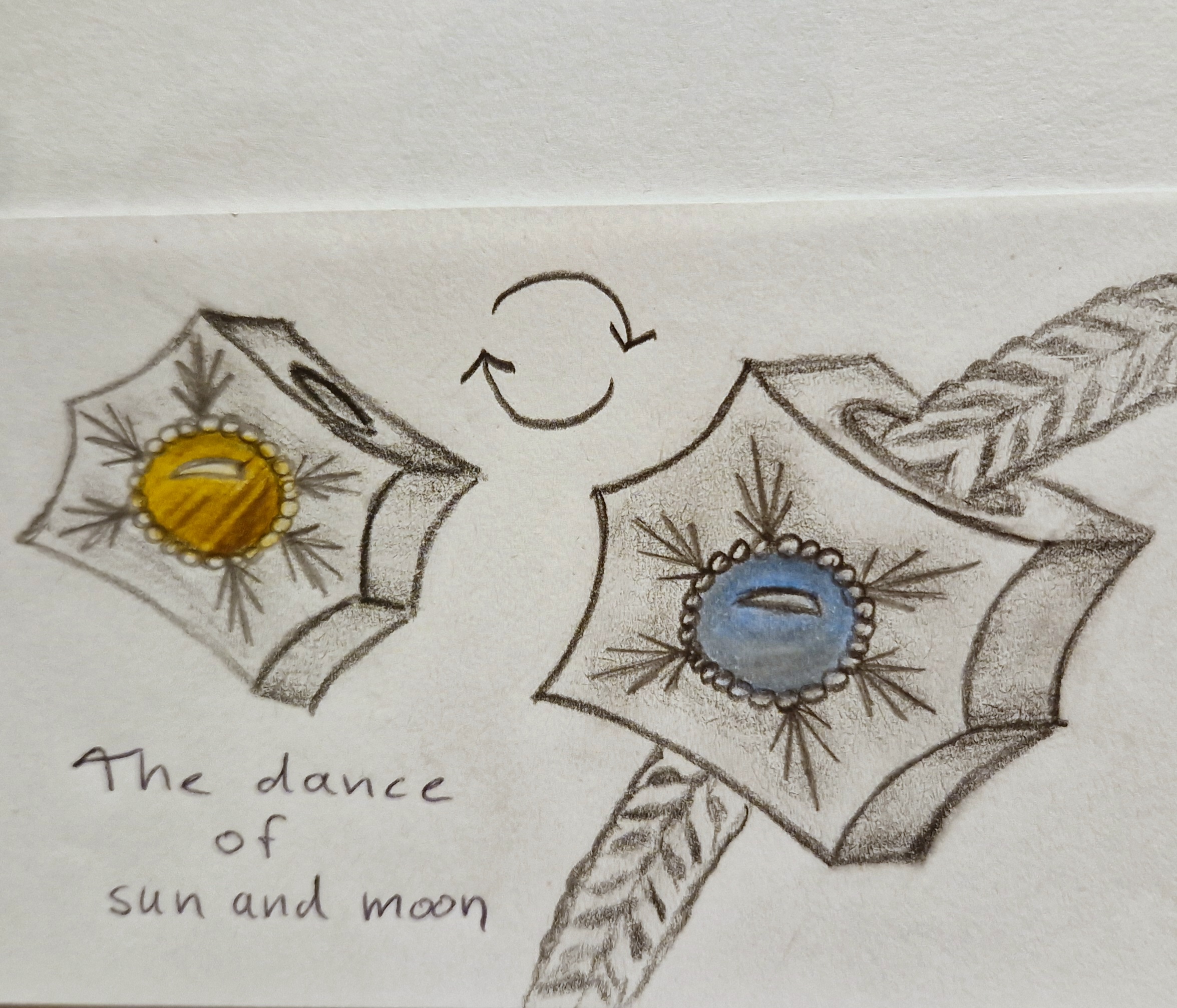 A silver bead with two different sides, one side with a cool, blueish moonstone, the other with a warm, golden tiger's eye stone. When the bead moves and hence turns on your bracelet, it represents the circle of night and day, the endless dance of sun and moon
