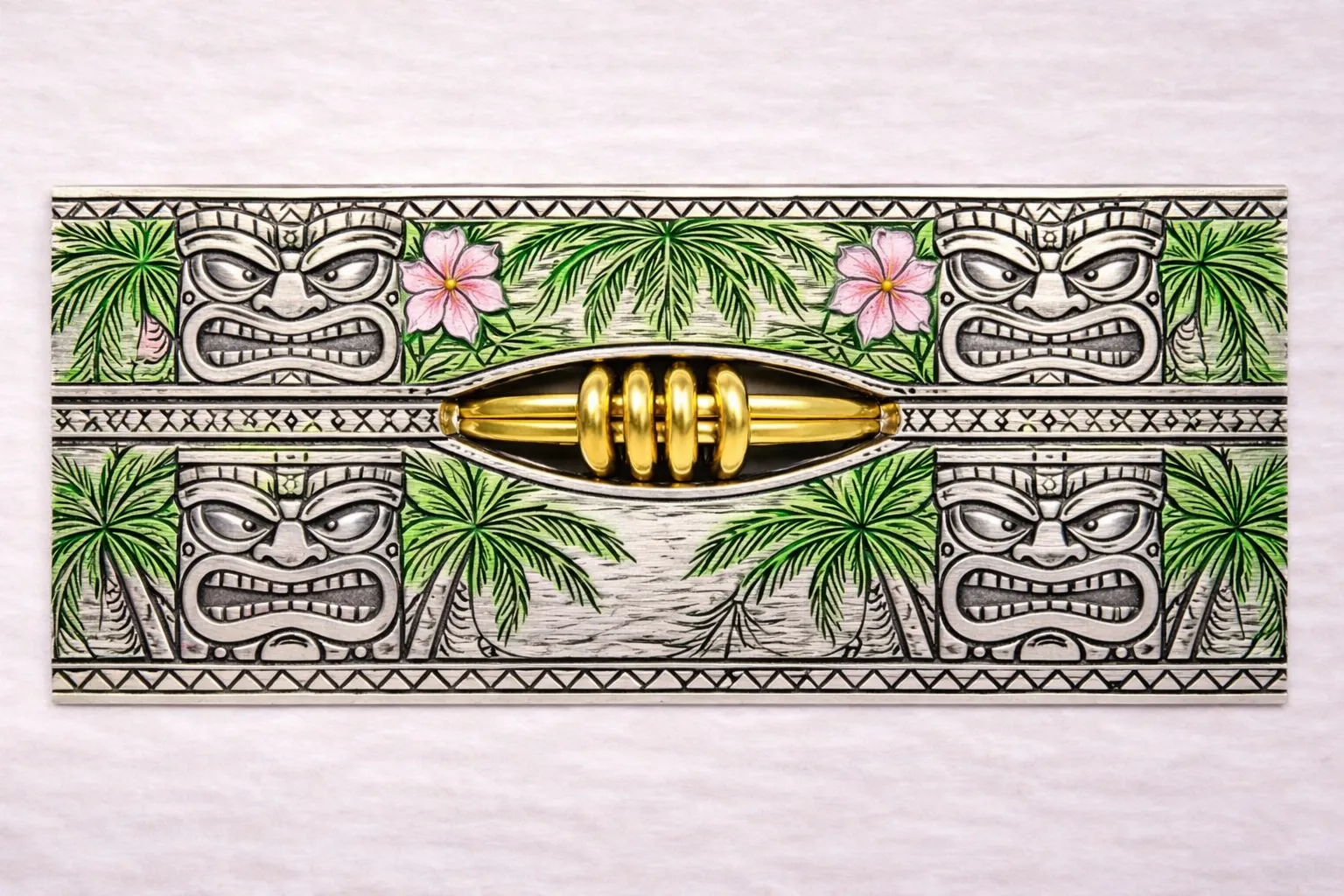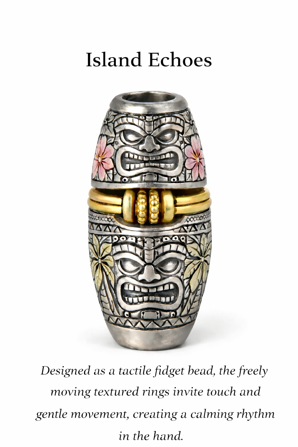Subtle tropical colours bring the engraving to life, with soft translucent tones highlighting flowers and palms, while freely moving textured gold rings add warmth, movement, and a calming tactile interaction. Designed as a tactile fidget bead, the freely moving textured rings invite touch and gentle movement, creating a calming rhythm in the hand.