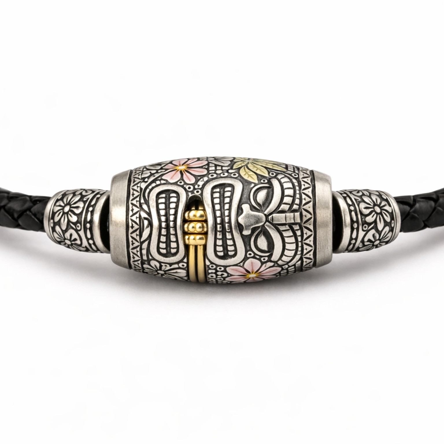 Sterling silver with engraved detailing and patina, accented with moving textured gold rings and subtle translucent enamel.