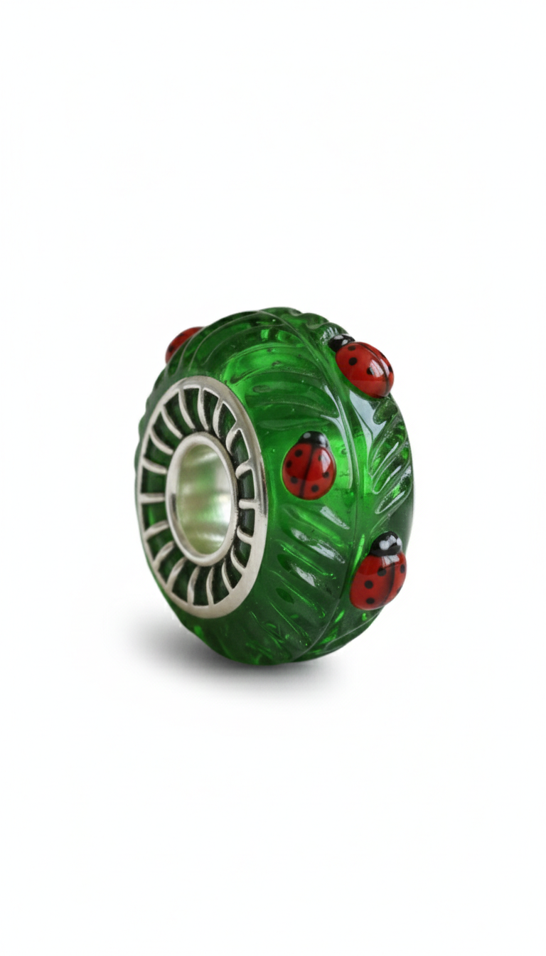 Sur cette surface de verre, une feuille simplement stylisée par des nervures s’enroule délicatement. C’est sur ce sentier végétal que de petites coccinelles avancent. Leur présence apporte une touche colorée, de chance et de vitalité. Elles semblent marcher, presque animées, comme si la perle capturait un instant de vie en miniature.