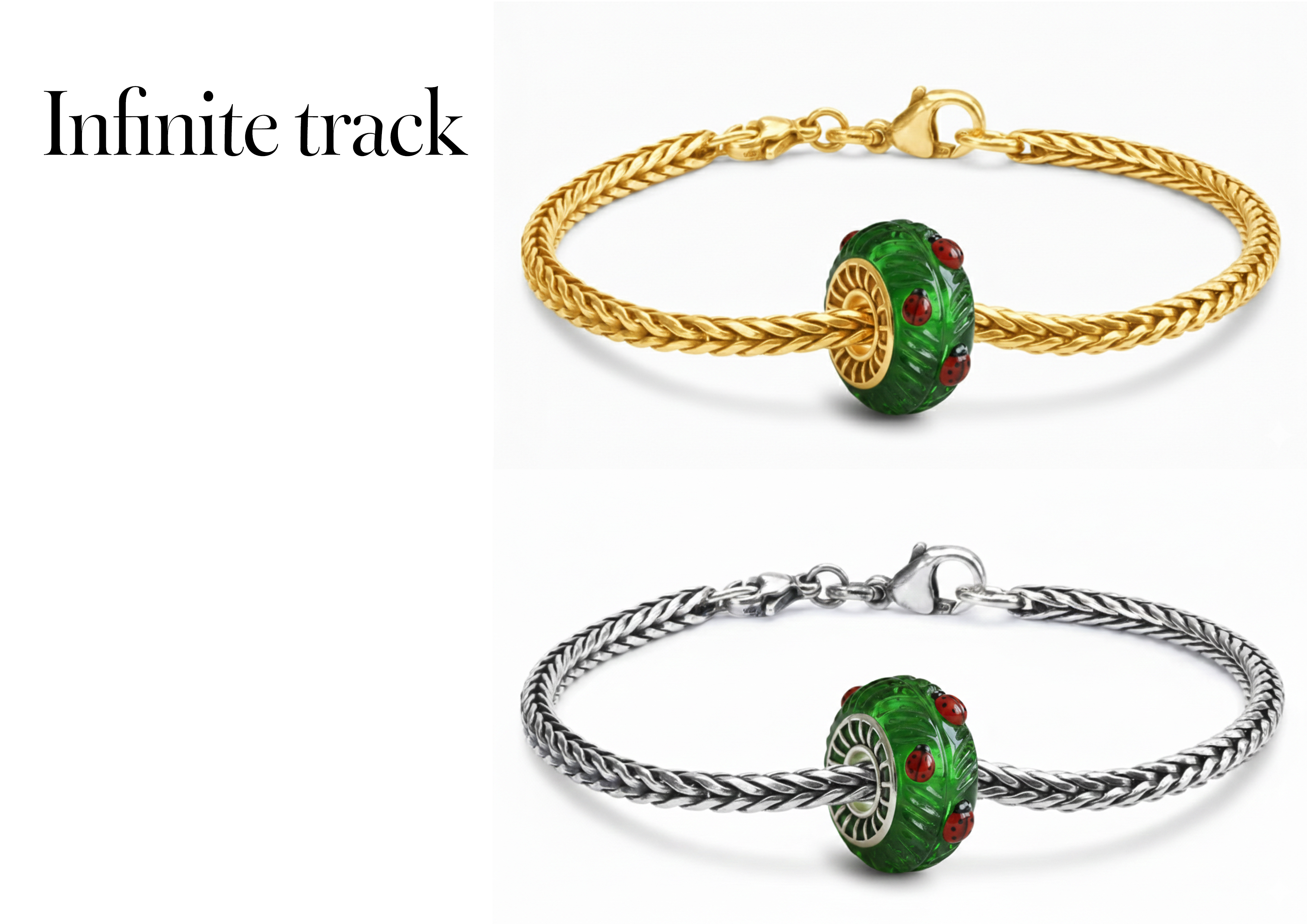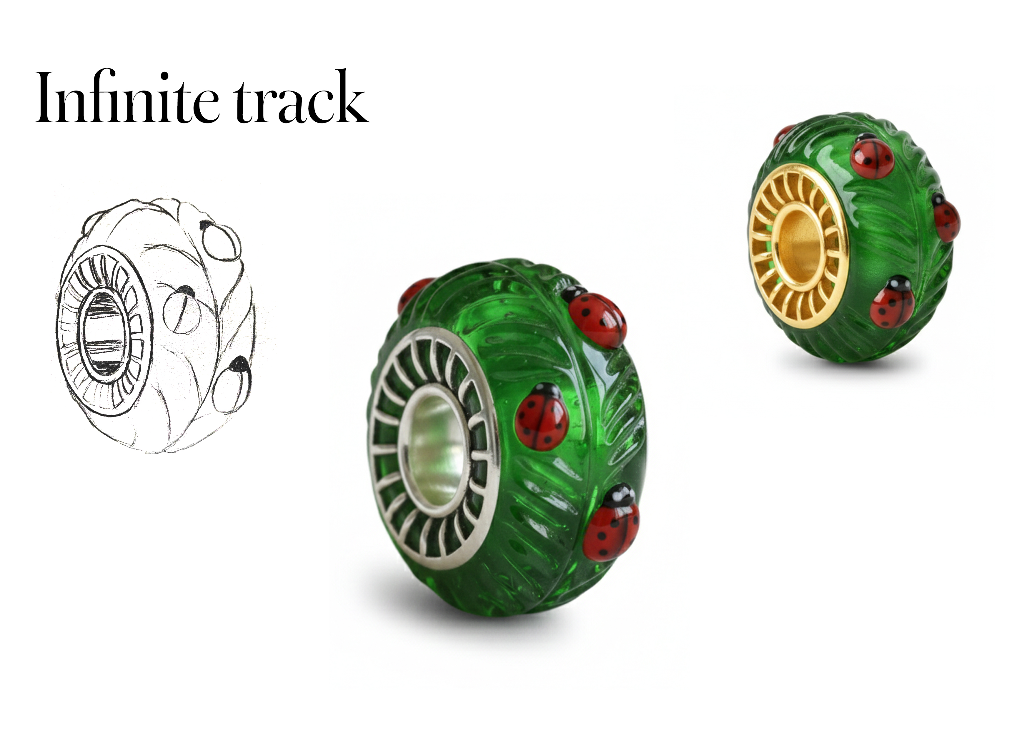 “Piste infinie” est une perle en verre et argent, pensée comme une petite scène vivante où la nature se met en mouvement. Sa forme parfaitement ronde crée un parcours continu, un cercle sans début ni fin, comme une boucle éternelle.