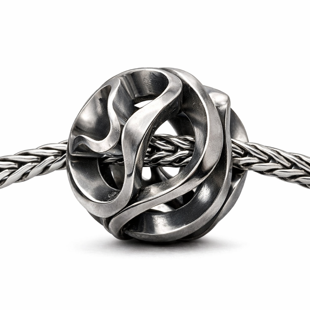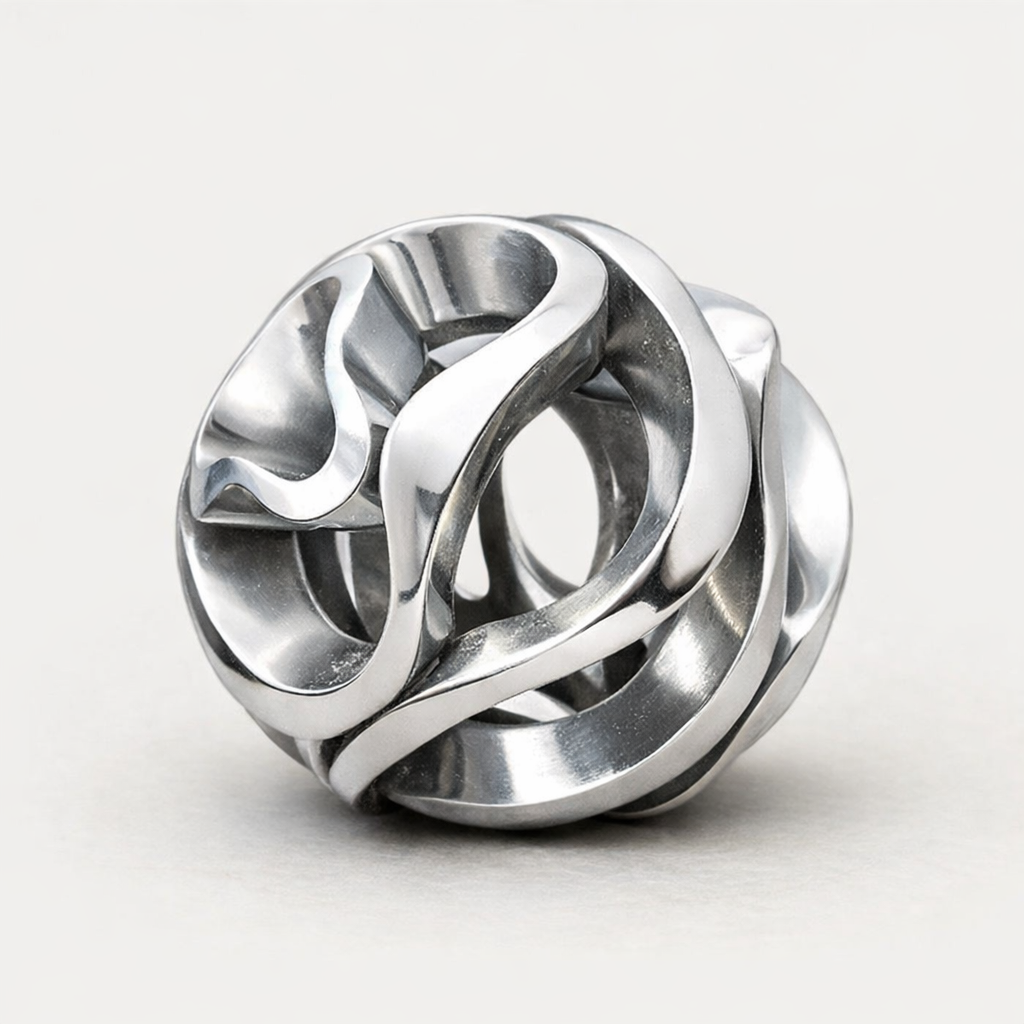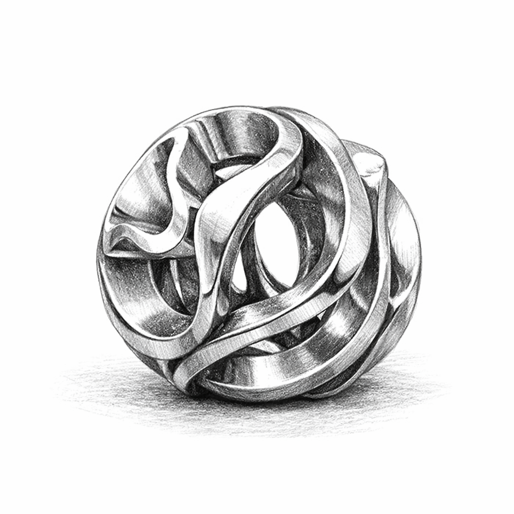 The intertwined lines resemble orbits that constantly revolve around an invisible center, creating a sense of inner balance and infinity. The form seems to hold space within itself—like a miniature universe enclosed in silver.