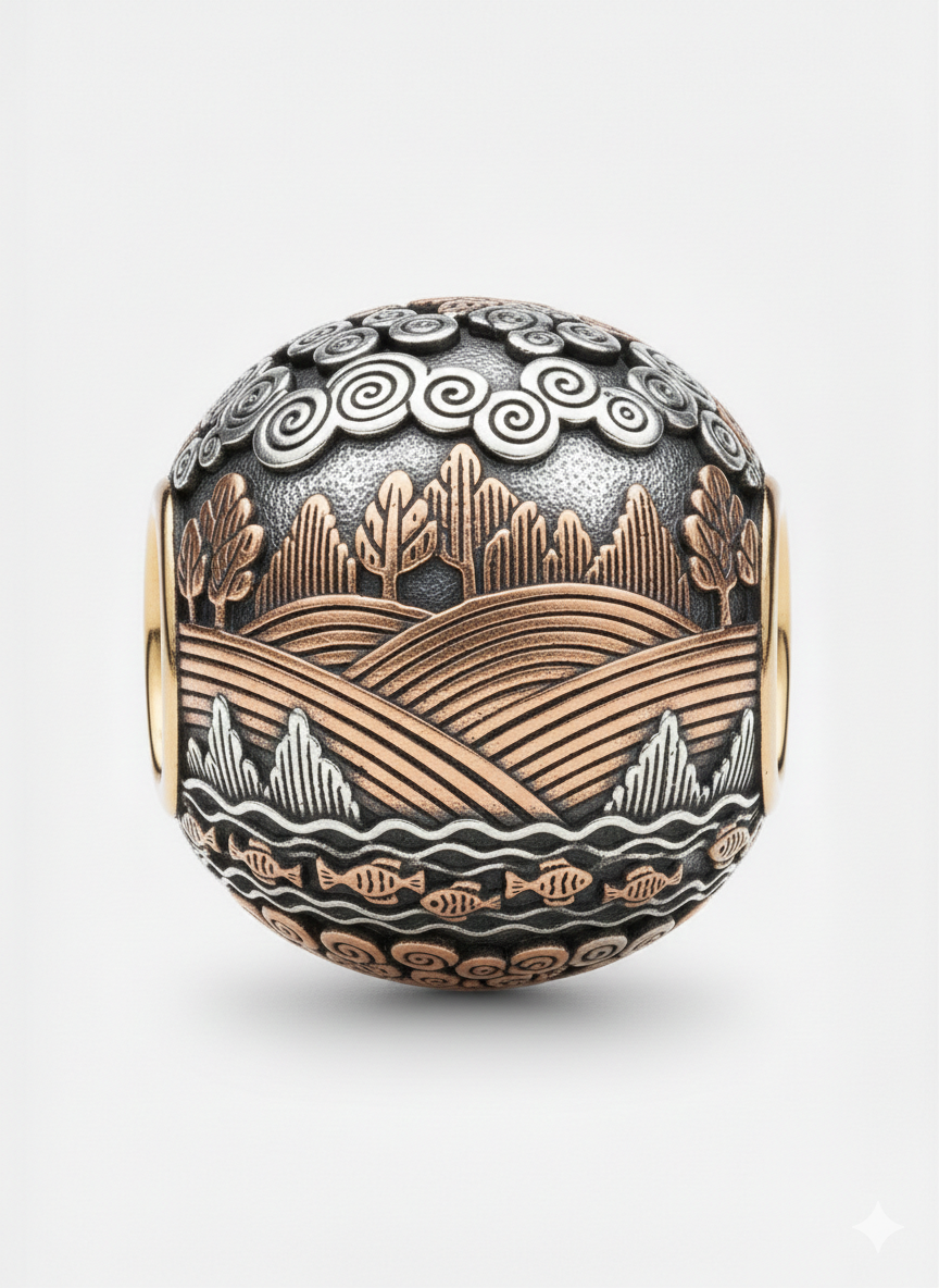 Altrove è il bead che trasforma il tuo bracciale nel confine tra realtà e immaginazione. Una sfera in argento, oro e rame dove perdersi per ritrovarsi.