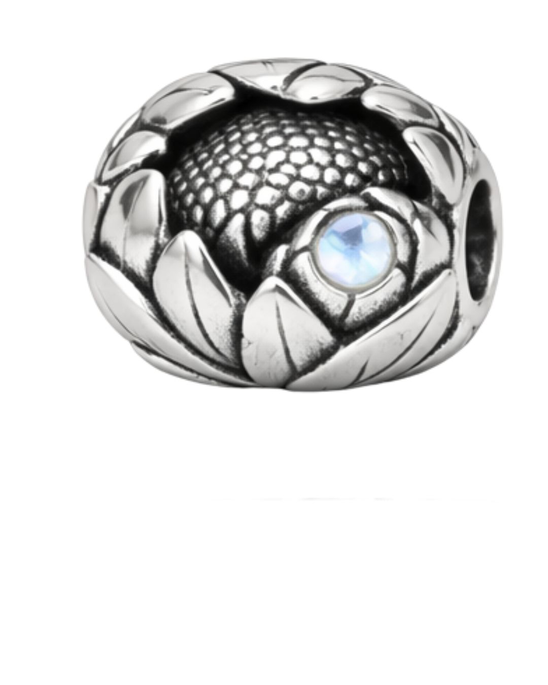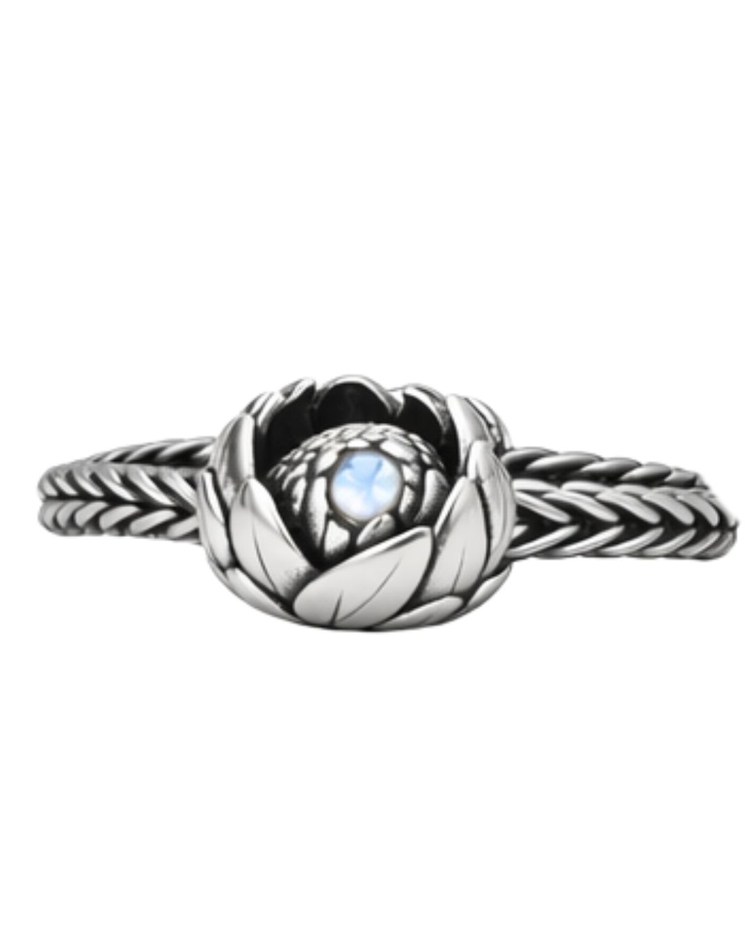 A tiny moonstone at the connection point where the bud nests into the bloom, like a seal of care. The moontone a promise, the link between mentor and learner, a talisman for personal growth, new ventures, and transformation.