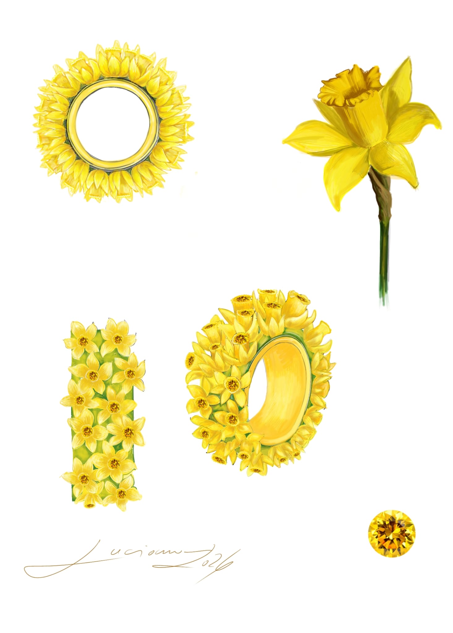 The first project is inspired by yellow snowdrops (daffodils) — symbols of spring, hope, and new beginnings. Yellow crystal accents bring light and elegance, while the green enamel background creates contrast and emphasizes regeneration.