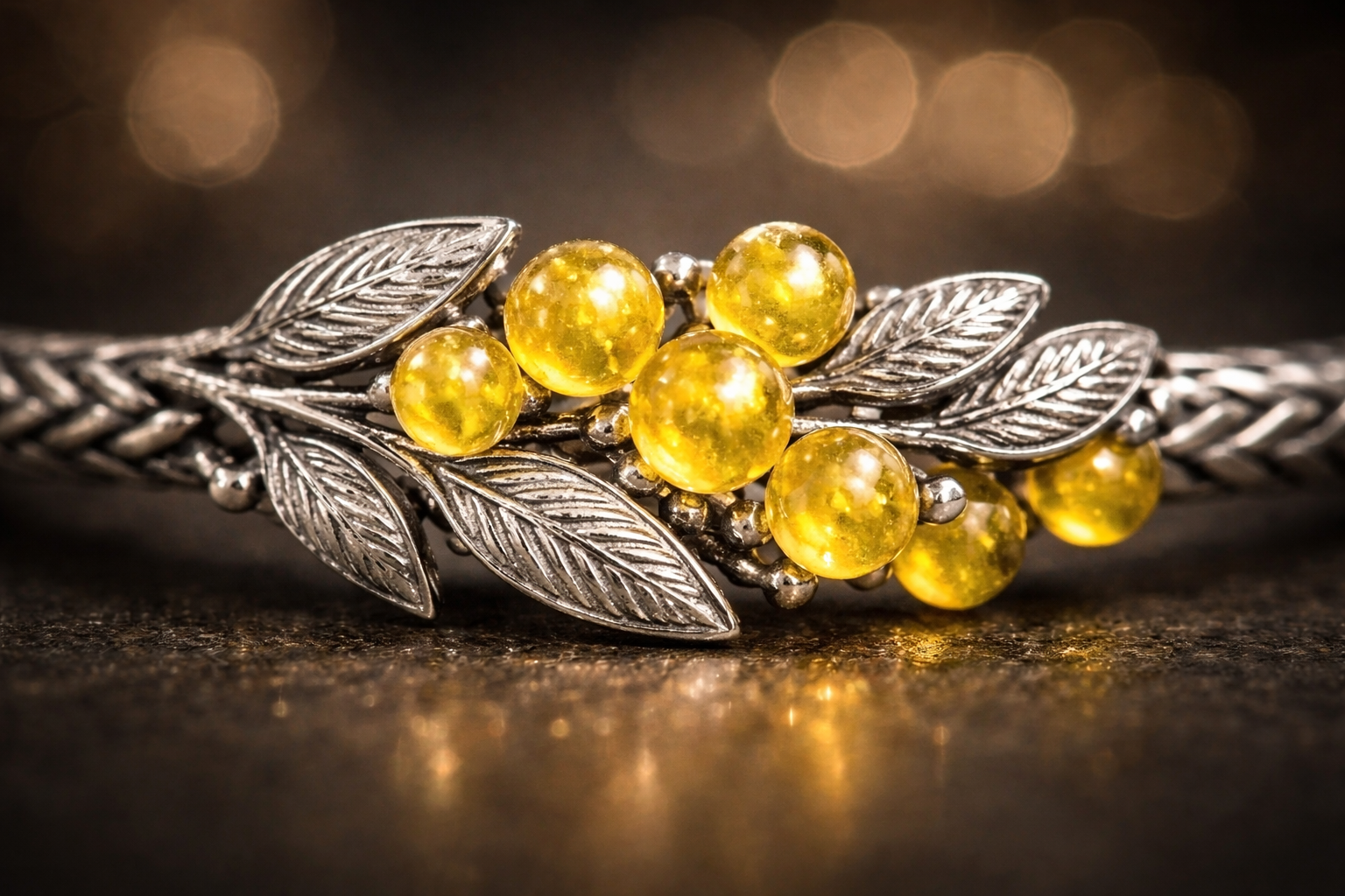 Ses feuilles finement sculptées en argent s’entrelacent avec légèreté, tandis que de petites billes en verre de Murano jaune éclatant évoquent ses pompons solaires.