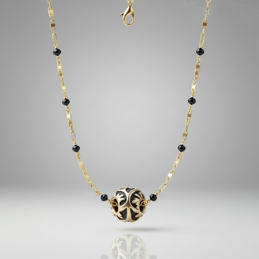 "ORNATUS" represents autonomy, strength, independence, and mystery. The fusion of black and gold, with gold elements, creates a sophisticated, bold piece with striking color contrasts.